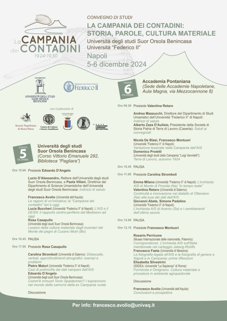 Il Comitato per la salvaguardia e la valorizzazione del Patrimonio Linguistico Napoletano presenta un convegno dal titolo “La Campania dei contadini: storia, parole, cultura materiale”, previsto il 5 e il 6 dicembre 2024 alle università degli Studi Suor Orsola Benincasa e Federico II di Napoli, svolto in collaborazione con l’Accademia Pontiana.